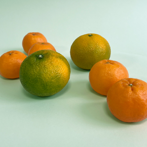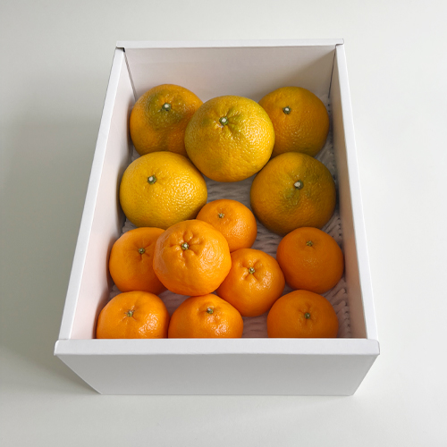 【スイートスプリング】スイートスプリングは、温州みかんと八朔を交配して生まれた比較的新しい柑橘で外皮は緑色や黄色ですが、爽やかな甘さと豊富な果汁が特徴で「甘い春」を感じさせます。ごつごつした外観からは想像できないほど、果汁が豊富でジューシーで、酸味が少なく、上品で爽やかな甘さです。早春に収穫されて、糖度が高く風味良好であることから「スイートスプリング」と名付けられました。糖度は12度程度で、時期が遅くなり黄色く色づくにつれて甘みが増します。八朔のような苦味もほとんどないため甘くて後味の良さを好む方におすすめです。皮が厚く剥きにくいので、ナイフで櫛形にカットして食べるのがおすすめです。 【ぽんかん】 ポンカンは濃厚な味わいと独特の香りで人気を集め、お子様から大人の方まで幅広い年齢層に愛されています。甘いみかんが好きな人で、酸っぱいものが苦手な方にもおすすめです。外皮はボコボコしていますが、手で簡単にむけ、中の薄皮(じょうのう膜)も柔らかいので、そのまま食べられます。もし酸っぱいと感じる場合は、風通しの良い場所で1週間〜10日ほど置くと酸味が抜け、甘さが引き立ちます。